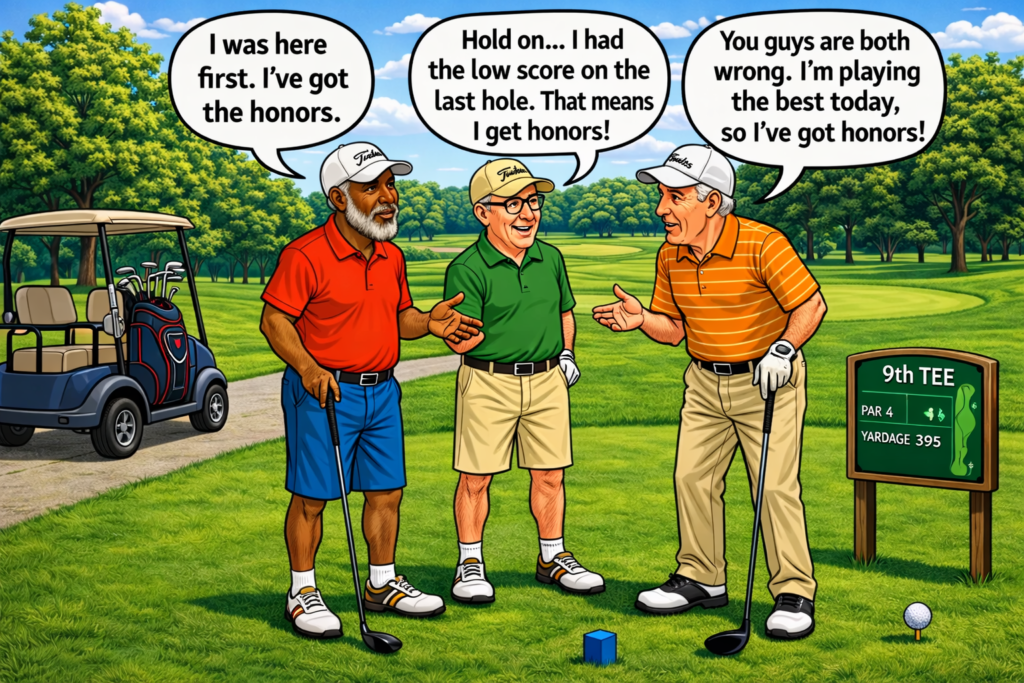 A friendly sunset golf debateGolfers debating a gimme puttGolfers grumble about cart path only ruleBe honest… who’s the ‘almost ready’ guy in your group?Golfers disputing honors at the 9th teeGolfers debate the extra foot advantageGolfers settle their bets at clubhouse table